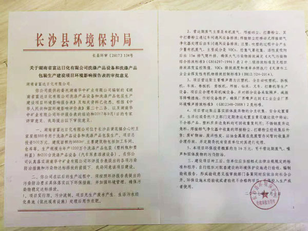 湖南富達日化獲得洗滌設(shè)備和車用尿素設(shè)備環(huán)評資質(zhì)及生產(chǎn)許可證