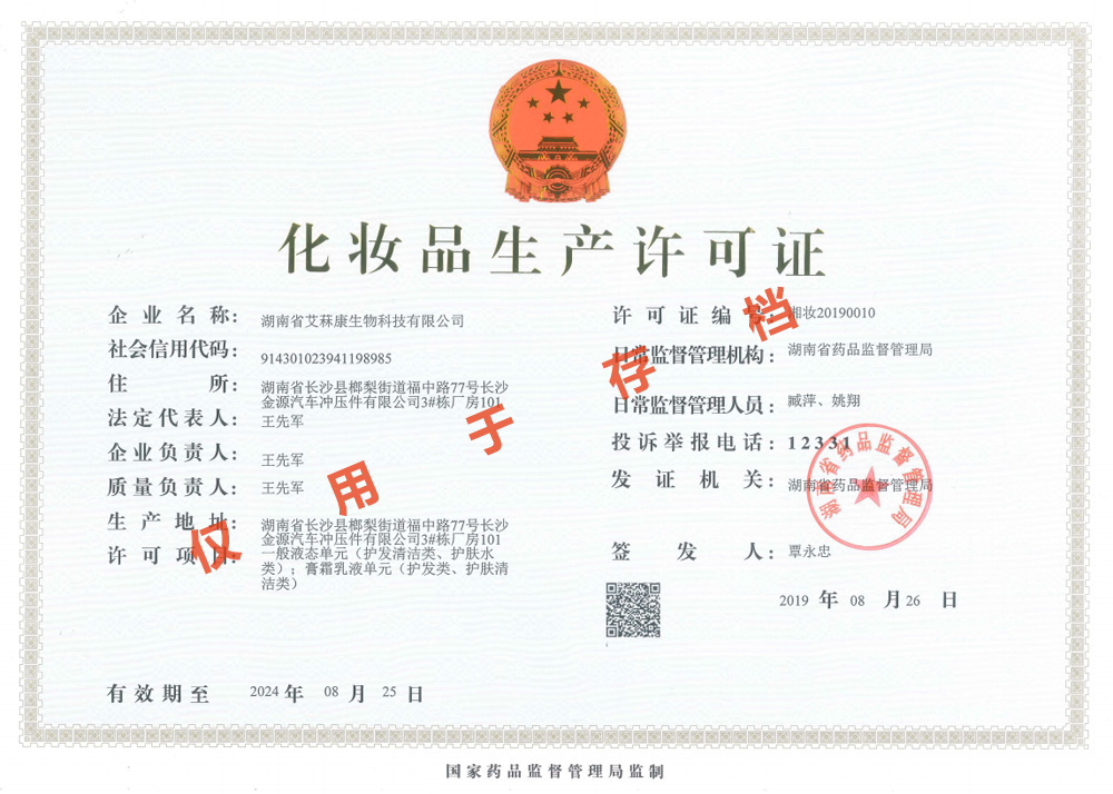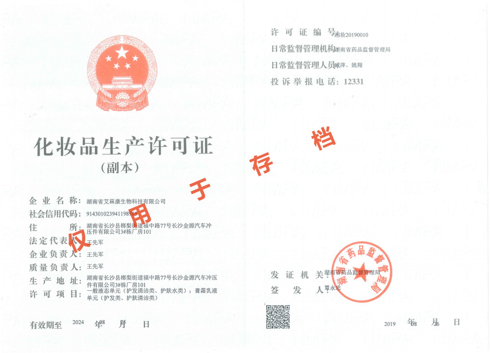 多項專利發(fā)明人王先軍 手機:150-7483-5702 手機:195-7316-0288經(jīng)食藥監(jiān)局領導專家們層層審核并一致通過,富達艾菻康公司正式獲得了化妝品生產(chǎn)許可證。消息傳來,公司全體員工群情激奮,熱烈歡呼。此次順利通過現(xiàn)場驗收并取得化妝品生產(chǎn)許可證,標志著公司已完全具備了生產(chǎn)和銷售一般液態(tài)單元(護發(fā)清潔類、護膚水類);膏霜乳液單元(護發(fā)類、護膚清潔類)的資質(zhì),這將成為公司進軍化妝品行業(yè)的新起點。