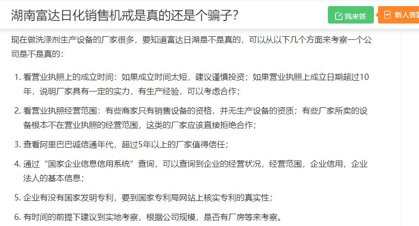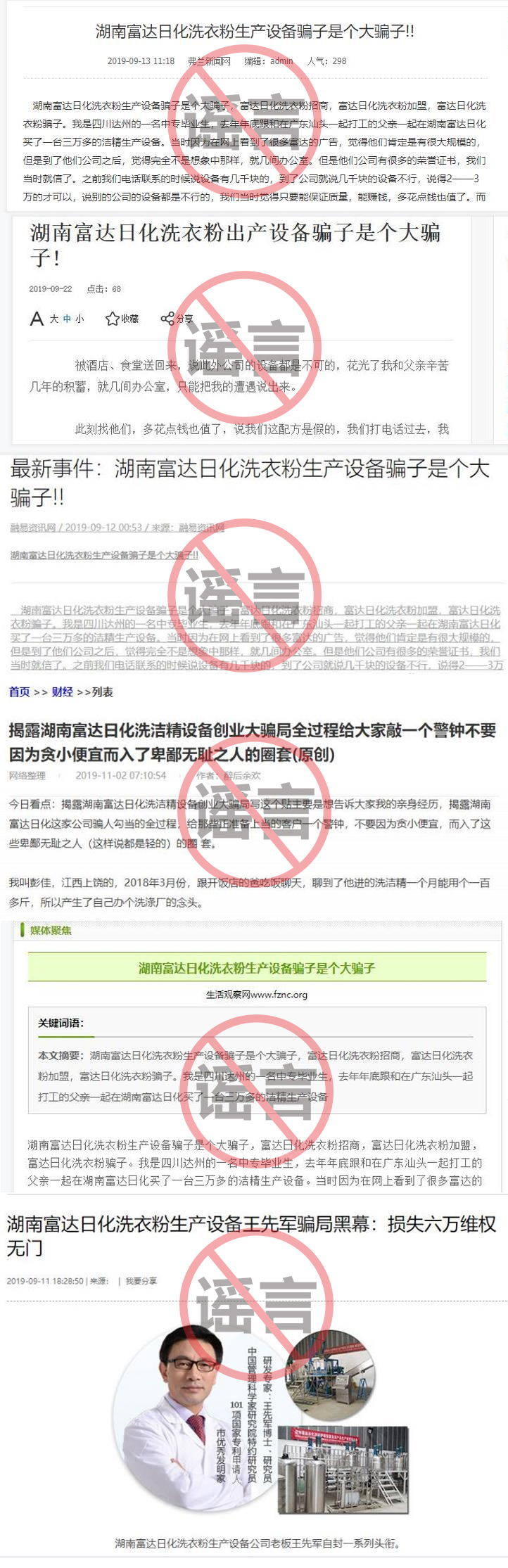 不難發(fā)現(xiàn),這些文章的主人公不一樣,但發(fā)文章的時(shí)間卻出奇的一致,都集中在2019年9月份左右。這是為什么呢?這些同行之所以惡意誹謗富達(dá)日化,是因?yàn)楹细贿_(dá)日化發(fā)起的中國(guó)創(chuàng)業(yè)者防騙鋤騙互助沙龍微信群公開揭露了北京武漢等地的偽劣洗潔精設(shè)備和偽劣洗衣液設(shè)備及偽劣車用尿素設(shè)備,達(dá)到打擊報(bào)復(fù)惡意誹謗富達(dá)日化的目的。眾所周知,富達(dá)日化成立30多年,創(chuàng)始人王先軍是一百多項(xiàng)專利的發(fā)明人,他的所有產(chǎn)品都是被國(guó)家所認(rèn)可。而當(dāng)富達(dá)日化的創(chuàng)始人公開打假、公開揭露北京武漢同行偽劣洗潔精設(shè)備偽劣洗衣液設(shè)備偽劣車用尿素設(shè)備內(nèi)幕的時(shí)候,騙局制造者們狗急跳墻,試圖用捏造事實(shí)惡意攻擊湖南富達(dá)日化的行為阻止中國(guó)鋤騙防騙互助沙龍的打假行為,湖南富達(dá)日化的回答是:絕對(duì)辦不到!