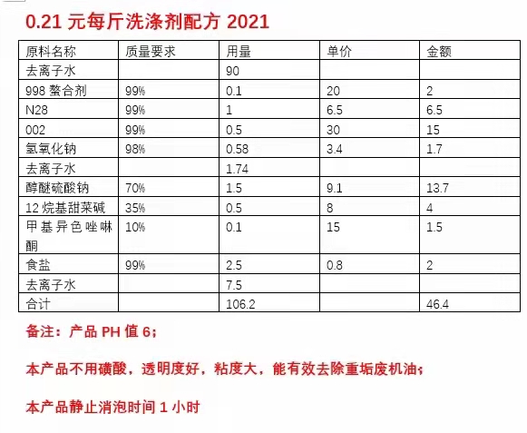 0.2元高濃度非磺酸洗潔精洗衣液最新配方分享
