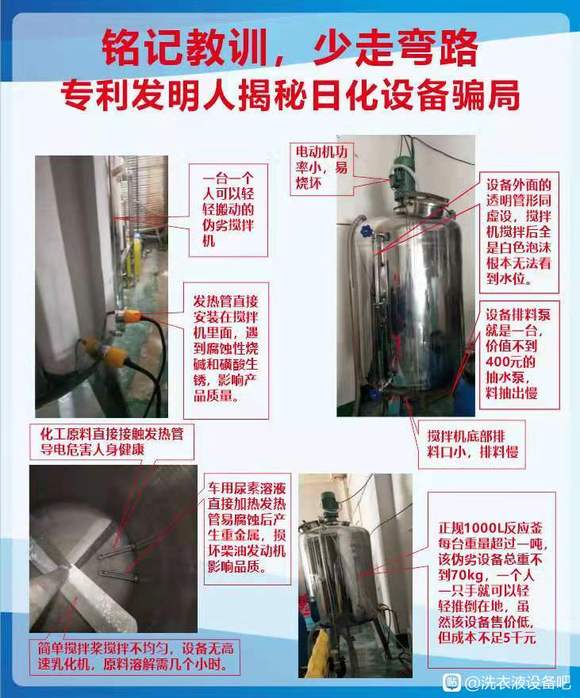 多項專利發(fā)明人王先軍 手機:150-7483-5702 手機:195-7316-0288洗潔精洗衣液車用尿素設備銷售者五花八門,許多不法商販炮制萬元投資可辦廠的謊言,推銷低價偽劣洗潔精設備,洗衣液設備,車用尿素設備,無數(shù)初創(chuàng)業(yè)者上當受騙血本無歸,為了讓創(chuàng)業(yè)者少走彎路,受良心驅(qū)使,公開揭示日化設備騙局,以此讓大家少走彎路。