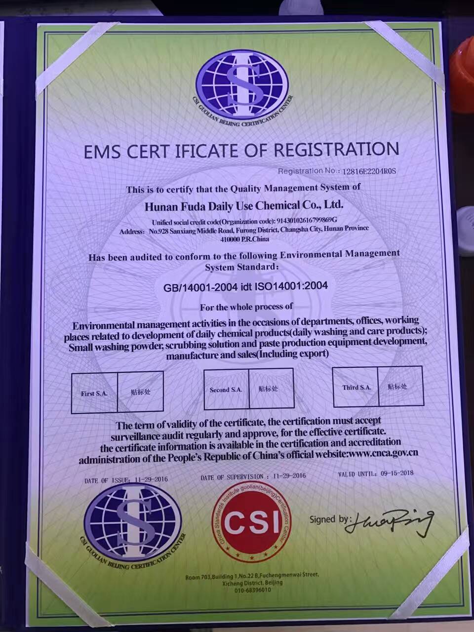 富達日化通過努力于2016年11月獲得 ISO9001國際質(zhì)量管理體系認證和ISO14001國際環(huán)境認證。富達日化建于1985年,原名富達洗衣粉廠,1997年成立湖南省富達日化有限公司,下設(shè)富達日化設(shè)備廠、富達洗滌用品廠、艾菻康生物科技有限公司、富達小發(fā)明家搖籃教育科技有限公司,是一家具有產(chǎn)品進出口資格的綜合性企業(yè)。公司地處湖南長沙市中心,是一代偉人毛澤東主席及原國家主席劉少奇同志故鄉(xiāng)。地理位置優(yōu)越,交通便捷。湖南省富達日化有限公司主要生產(chǎn)銷售各種洗滌用品、洗衣粉生產(chǎn)設(shè)備、系列液體洗滌劑生產(chǎn)設(shè)備、肥皂、透明皂設(shè)備、顆粒成型機、化工干燥設(shè)備、反滲透水處理器等日化機械,集日化新技術(shù)產(chǎn)品研發(fā)、設(shè)備和洗滌產(chǎn)品生產(chǎn)銷售、日化產(chǎn)品分析化驗和技術(shù)服務(wù)于一體,先后通過了ISO質(zhì)量管理體系認證、CE認證。公司擁有多項新技術(shù)產(chǎn)品國家專利,曾兩次獲得中國國際新技術(shù)產(chǎn)品博覽會科技創(chuàng)新金獎,享受國家科技部重點立項產(chǎn)品創(chuàng)新基金支持。設(shè)備和技術(shù)遍布全國各地,并出口越南、哈薩克斯坦 、馬來西亞、俄羅斯、伊朗、非洲等多個國家和地區(qū)。