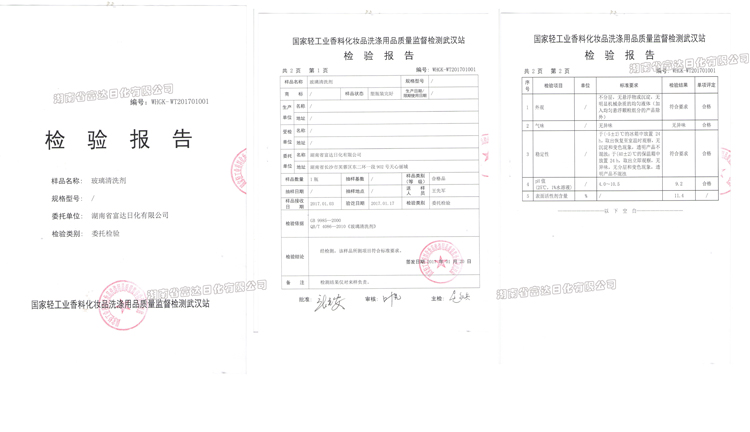 富達(dá)日化生產(chǎn)的玻璃水設(shè)備,主要包含水處理設(shè)備、水計量設(shè)備、反應(yīng)釜、灌裝機(jī)等組成符合生產(chǎn)國家標(biāo)準(zhǔn)的玻璃水。為用戶提供中、高、低檔玻璃水配方,提供包裝、原料、辦廠證件,聯(lián)營辦廠,讓您銷售無憂。2017年2月,由公司自主研發(fā)的玻璃水配方生產(chǎn)的相思竹玻璃清洗劑送到國家輕工業(yè)香料化妝品洗滌用品質(zhì)量監(jiān)督檢測武漢站檢測,根據(jù)GB9985—2000 QB/T 4086-2010《玻璃清洗劑》等檢測依據(jù),送檢的產(chǎn)品符合標(biāo)準(zhǔn)要求。