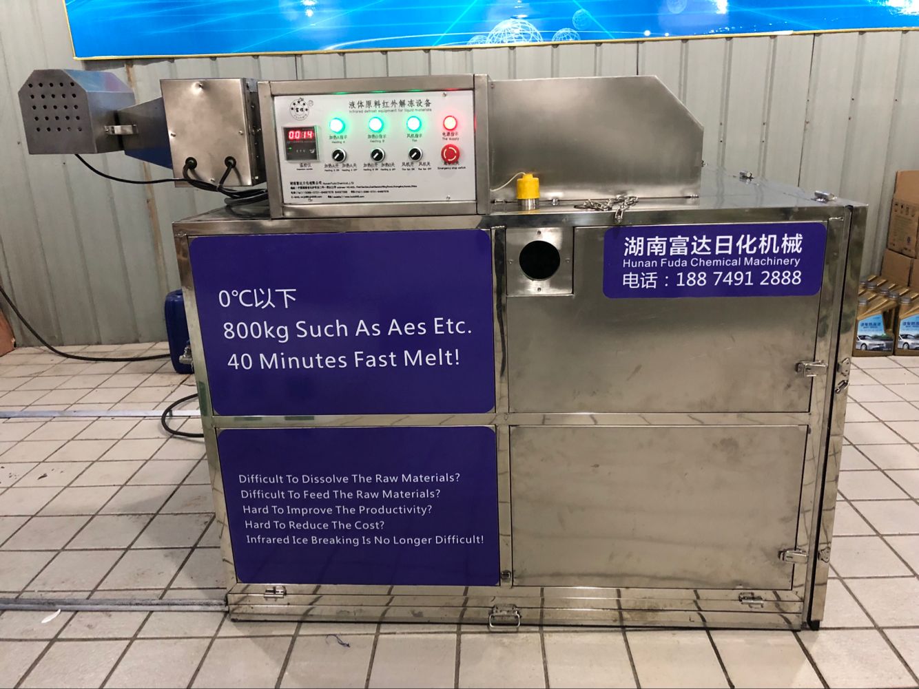 多項專利發(fā)明人王先軍 手機:150-7483-5702 手機:195-7316-0288AES等洗滌產(chǎn)品原料快速溶解有辦法,最近,由湖南省富達日化有限公司100多項國家專利申請人王先軍博士研發(fā)的一種紅外解凍設備,可以快速解決低溫狀態(tài)下化工原料冰凍后加料難、取料難的問題,廣泛用于洗滌產(chǎn)品生產(chǎn)需要。